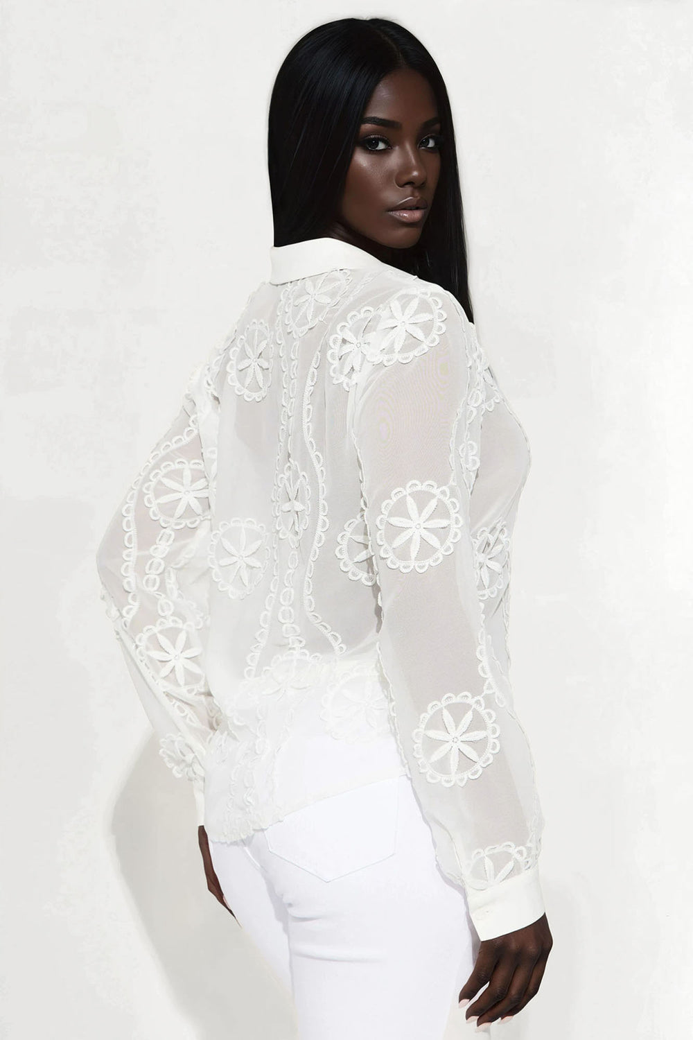 Brunch Lady Floral Embroidery Chiffon Shirt – White