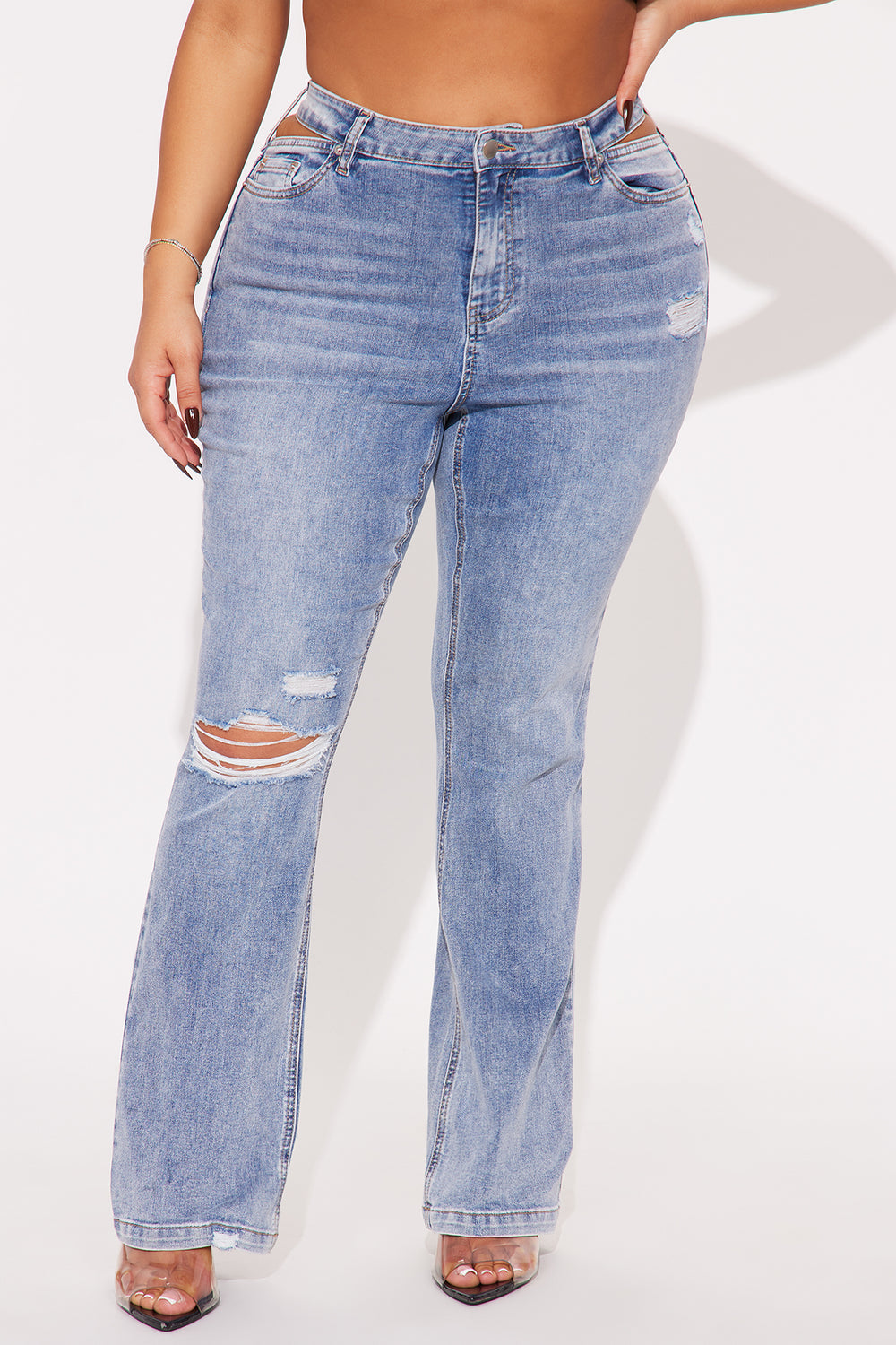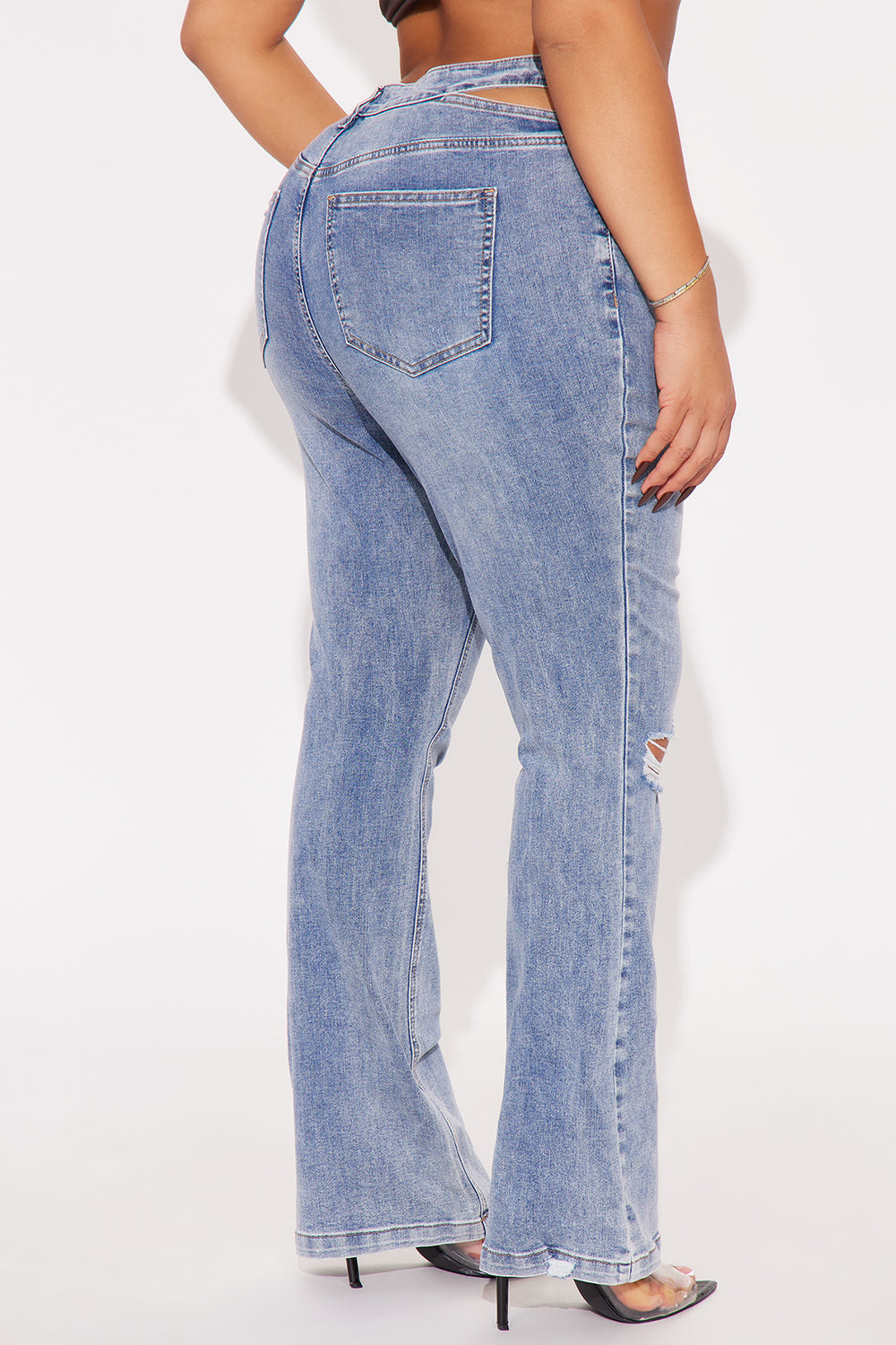 Stretch Cut Out Ripped Bootcut Jeans – Dark Wash